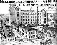 Кроме универмага компании принадлежала «Фабрика мебели и бронзы» на Малой Грузинской улице. Главный корпус в стиле английской готики был возведён в 1902 году по проекту Романа Клейна. Внешне здание напоминает шотландский замок с высокой башней и стрельчатыми окнами. Рядом находились одноэтажные постройки складов, конюшен и литейных мастерских[17]. Мебель от «Мюра и Мерилиза» закупал императорский двор, эскизы моделей выполняли ведущие художники и архитекторы тех лет. Особенностью предприятия стала поставка законченных интерьеров собственной работы. Кроме мебели, фабрики производили наборный паркет, дизайнерские обои и переплёты книг[11][6][18]. В 1922 году Охотничий переулок, на который выходил фабричный двор, был переименован в Столярный[3].