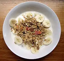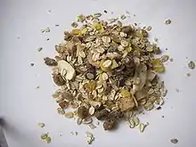 Мю́сли (нем. Müsli, (Bircher)müesli, несклоняемое сущ.; прилагательные согласуются с ним в форме мн. ч.[1]) — еда, приготовленная из сырых или запечённых злаков, сухофруктов, орехов, отрубей, ростков пшеницы, мёда и специй.