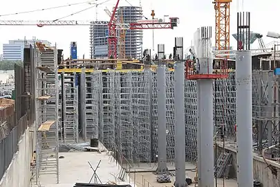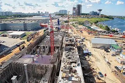 Тоннеле-проходческий механизированный комплекс начал работу в Мякининской пойме 30 июля 2008 года. Длина тоннеля — около 1300 метров[15]. Основные строительные работы на станционном комплексе выполнены строительной организацией «Тоннельный отряд № 6 Метростроя». Для бетонирования стен станции использовалась крупнощитовая сборно-разборная опалубка из алюминиевых балок МЕГАФОРМ AL. Для формирования монолитной плиты покрытия станции, толщина которой составляла более метра, а также для криволинейного в плане основания вестибюля специалисты компании «СТАЛФОРМ Инжиниринг» разработали проект опалубочной системы на основе универсальной опалубки перекрытий в стальных оцинкованных рамах СТАТИКО Szn.