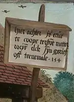 - рукописная табличка в правом верхнем углу содержит надпись о продаже земли — отражение событий 1551 года в Антверпене, связанных с продажей городом излишков земли застройщику, чья деятельность привела к волнениям в народе[7].