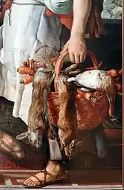 В левой части виден пейзаж с уходящей вдаль дорогой и едущей процессией, в которой можно узнать святое семейство — Марию с младенцем, едущую на осле и подающую хлеб нищей девочке, и Иосифа, наблюдающего за этим. Эта сцена иллюстрирует новозаветный сюжет о бегстве святого семейства в Египет. Одежда всех изображённых, а также обстановка, предметы быта и здание на заднем плане в левом углу современны автору, что типично для религиозной и исторической живописи XVI века.