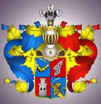 Щит разделён на четыре части, из коих в первой в голубом поле видна с правой стороны выходящая из облак в золотые латы облечённая рука с мечом (польский герб Малая Погоня). Во втором в красном поле белое распростёртое крыло. В третьей части в красном же поле находится серебряная крепость. В четвёртой части в голубом поле изображён выходящий из подошвы щита до половины золотой лев с мечом, вверх подъятым (польский герб Лев II). Щит увенчан дворянскими шлемом и короною с страусовыми перьями. Намёт на щите голубый и красный, подложенный золотом.