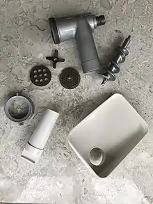 Мясорубки могут быть также в виде дополнительных приспособлений в составе кухонных комбайнов. Также, электрические мясорубки другой конструкции, представляющие собой высокооборотистую ножевую крыльчатку рубящего типа в корпусе, могут быть в виде дополнительной насадки ручного блендера.
