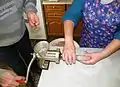 Процесс наполнения колбаски при помощи насадки