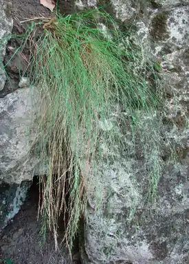 Дерновинное травянистое растение, 50—80 см высотой. Стебли довольно сильно шероховатые, с самым верхним узлом, расположенным в нижней трети стебля и часто выступающим из влагалищ. Листья 1—2,8 мм шириной, с обеих сторон шероховатые, вдоль свёрнутые или плоские. Влагалища более или менее шероховатые. Язычки 1—2,5 мм длиной.