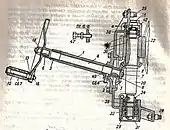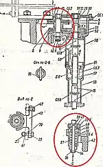 По другому принципу устроен привод принимающего углы возвышения. Это червячная передача и в ней сам червяк может свободно перемещаться вдоль оси, которая его вращает. Сверху его постоянно поджимает пружина сжатия, стремясь переместить его вдоль оси. Таким образом она постоянно прижимает его к червячному колесу. Этим обеспечивается постоянное автоматическое устранение мёртвого хода в передаче[8].
