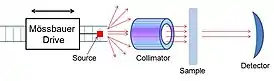 Спектрометр состоит из трёх основных частей: радиоактивного источника, перемещаемого по направлению от и к образцу, коллиматора, формирующего параллельный пучок гамма-квантов из их расходящегося потока от источника, держателя исследуемого образца и детектора гамма-излучения. Перемещение источника осуществляется обычно электромагнитным механическим приводом, по принципу действия подобным электродинамическому громкоговорителю, сообщающим источнику колебательное синусоидальное перемещение.