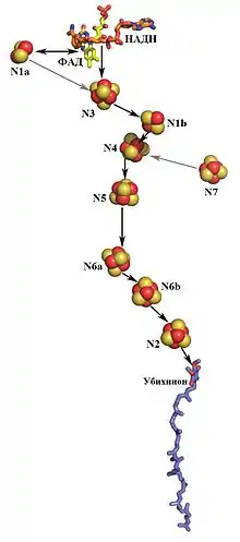 Необычные лиганды имеет и терминальный кластер цепи — N2. Его редокс-потенциал самый высокий из всех кластеров (от —0,1 до —0,15 В). Он связан с четырьмя последовательно расположенными в полипептидной цепи остатками цистеина, что создаёт напряжённую конформацию. Из-за этого при его восстановлении происходят конформационные изменения соседних цепей, возможно, связанные с транспортом протона[4].