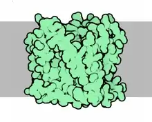 ![]() Серым цветом показана внутренняя мембрана митохондрии. Сверху — митохондриальный матрикс, снизу — межмембранное пространство. | |