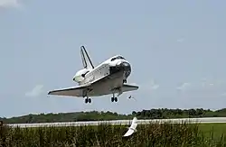 Космическая транспортная система (англ. Space Transportation System), более известная как Спейс шаттл (от англ. Space shuttle — космический челнок) — американский многоразовый транспортный космический корабль[6]. Шаттл запускался в космос с помощью собственных ракетных двигателей и твердотопливных ускорителей, осуществлял манёвры на орбите как космический корабль и возвращался на Землю как самолёт[6]. Подразумевалось, что шаттлы будут сновать, как челноки, между околоземной орбитой и Землёй, доставляя полезные грузы в обоих направлениях. При разработке предусматривалось, что каждый из шаттлов должен был до 100 раз стартовать в космос. На практике же всего осуществлено 135 стартов. К марту 2011 года больше всего полётов совершил шаттл «Дискавери» (39). В ходе программы в катастрофах погибли 2 корабля и 14 астронавтов.