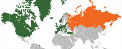 Фактически, начиная со своего основания, НАТО была ориентирована на противодействие СССР и, позднее, также странам — участницам возглавлявшегося СССР Варшавского договора, заключённого в 1955 году.