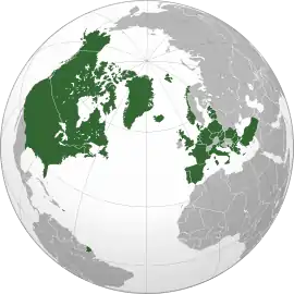 НА́ТО, Организа́ция Североатланти́ческого догово́ра, Североатлантический Алья́нс (англ. North Atlantic Treaty Organization, NATO; фр. Organisation du traité de l'Atlantique Nord, OTAN) — военно-политический блок, объединяющий большинство стран Европы (включая Турцию), Соединённые Штаты Америки и Канаду. Основан 4 апреля 1949 года в США с целью защиты Европы от советского влияния[~ 1][~ 2][~ 3][~ 4][~ 5]. Тогда государствами — членами НАТО стали 12 стран: США, Канада, Исландия, Великобритания, Франция, Бельгия, Нидерланды, Люксембург, Норвегия, Дания, Италия и Португалия. Это «трансатлантический форум» для проведения странами-союзниками консультаций по любым вопросам, затрагивающим жизненно важные интересы его членов, включая события, способные поставить под угрозу их безопасность. Одной из заявленных целей НАТО является обеспечение сдерживания любой формы агрессии в отношении территории любого государства — члена НАТО или защиты от неё.