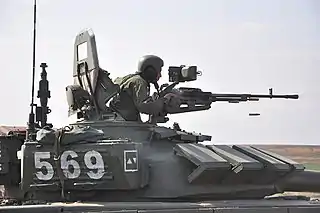 | пулемёт на танке Т-80 4-й гв. тд на огневом рубеже в ходе учебных стрельб на полигоне в Подмосковье | |