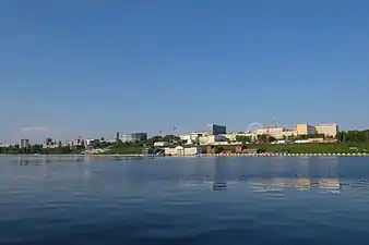 Вид на южную часть пруда, ограниченную набережной зодчего Дудина (внизу), проездом Дерябина (слева) и Южной набережной (вверху), с высоты колеса обозрения в парке Горького