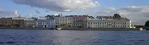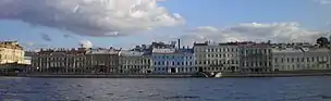 - Дом № 24 — дом графа А. Г. Кушелева-Безбородко. В 1775 году генерал И. И. Меллер, в придачу к двум ранее приобретённым, купил у Федула Михайлова его участок у Гагариной пристани (напротив нынешней Гагаринской улицы) с имевшимся на нём деревянным строением, сломав которое, выстроил трёхэтажный дом, в стиле раннего классицизма, — с главным фасадом на Неву, двумя двухэтажными флигелями и отдельно стоящим одноэтажным каменным флигелем, протянувшимся вдоль южной границы участка. При Меллере особняк сдавался внаём — одним из нанимателей был знаменитый авантюрист граф Калиостро. В 1799 году наследники И. И. Меллер-Закомельского продали дом графу Петру Кирилловичу Разумовскому. С 1825 года владельцем большого трёхэтажного дома стал А. Г. Кушелев-Безбородко[Комм 4]. В дальнейшем он принадлежал графине А. Г. Шереметьевой (в 1870-х годах), сыну декабриста князю М. С. Волконскому (в 1880-х годах), а в 1892 году перешёл купцу 1-й гильдии А. Г. Елисееву. В 1920-х годах в здании работала «Фабрика эксцентрического актёра», организованная кинорежиссёрами Г. М. Козинцевым и Л. З. Траубергом. В 1924 году здесь жил С. А. Есенин[6].