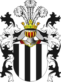 Три полосы чёрных с тремя белыми попеременно, по рассекающей линии. На шлеме три страусовых пера. Ср. Корчак (герб)[1].