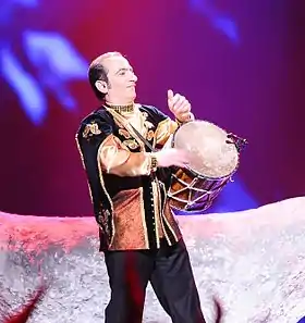 ![]() Азербайджанский музыкант Натик Ширинов играет на нагаре | |