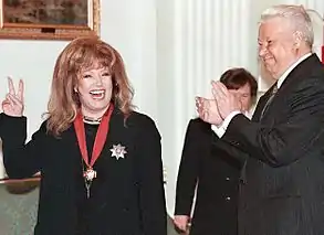 | Президент России Борис Ельцин вручает Алле Пугачёвой Государственную премию Российской Федерации. 7 июня 1995 года, Москва, Кремль. |