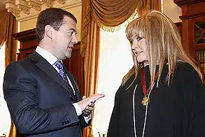 Президент России Дмитрий Медведев награждает Аллу Пугачёву орденом «За заслуги перед Отечеством» III степени. 15 апреля 2009 года, Москва, Кремль. |