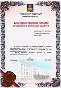 Благодарственное письмо Губернатора Брянской области |