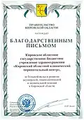 Благодарственное письмо Правительства Кировской области |