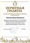 - почётные грамоты, благодарности и дипломы города Кирова, администрации и департаментов города.