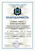 Благодарность Законодательного Собрания Приморского края является формой поощрения за высокие достижения в профессиональной деятельности, вклад в социально-экономическое развитие Приморского края, активное участие в общественной жизни Приморского края, иные особые заслуги. |