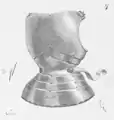 Доспех, изготовленный около 1380 года, представляет собой прогресс в изготовлении доспехов тех времён. Защита тела выполнена в виде нагрудника — предка более поздней кирасы. Нагрудник представляет собой сегментную конструкцию с большой выпуклой центральной пластиной, закрывающей грудь и живот, и меньшими пластинами, закрывающими бока. Между собой пластины соединены ремнями и заклёпками, на спине доспех застёгивается перекрещивающимися ремнями. Этот доспех ещё не являлся полным латным, так как для защиты тела помимо нагрудника использовалась кольчуга, но он дал начало отказу от бригантины как основной защиты тела. Основное его достоинство было в том, что в отличие от бригандины здесь грудь закрывалась крупными стальными пластинами, которые было гораздо труднее пробить. Недостатком же было то, что спина защищалась только кольчугой, поэтому подобная конструкция распространения не получила, а в более поздних доспехах спина защищалась так же, как и грудь.