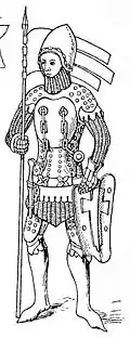 Бригантный доспех с латным набрюшником и стальной юбкой - перерисовка из миниатюр к хроникам Жана Фруассара, около 1470 года. Иллюстрация из книги Иммануила Виолле-Ле-Дюка.
