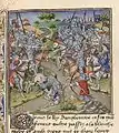Битва при Бринье. Миниатюра из хроник Жана Фруассара, около 1470 года. На убитом французе посредине хорошо виден латный набрюшник с юбкой и бригандным нагрудником.