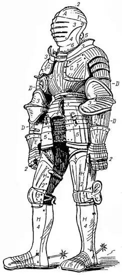 Доспех Максимилиана I, герцога Бургундии и императора Священной римской империи. Изготовлен в Нюрнберге мастером Лоренцом Кольманом (Хелмшмидтом) в 1475 году. Иллюстрация из книги Вендалена Бехайма.