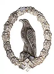 Нагрудный знак представляет собой венок из дубовых листьев с вплетенной в него лентой, в котором изображён орел, сидящий на краю скалы. Ниже изображена свастика. Знак цельнометаллический с плоским задником и вертикальной заколкой игольчатого типа.