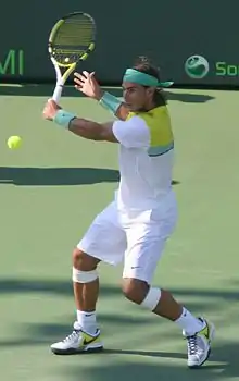 Надаль хорошо выполняет форхенд. Его левая рука делает удар и опускается через левое плечо; это немного отличается от традиционного опускания руки через противоположное плечо[29][30]. За последние годы Надаль значительно улучшил игру у сетки, его игра в этом компоненте стала более разнообразной и эффективной.