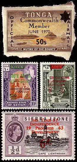 В 1970 году почтовая администрация Тонга решила отметить надпечатками вступление страны в британское Содружество наций, одновременно определив свои марки в авиапочтовые служебные (airmail official). Сьерра-Леоне в 1963 году отметилась на этом поприще, надпечатав на британских марках такие значимые события как «Второй год независимости. Прогресс. Развитие.» и «1853—1859—1963. Старейшая почтовая марка. Новейшая почта в Западной Африке», попутно сменив номинал и сделав часть марок авиапочтовыми в различных сочетаниях и цветах надпечаток. Признаки подобного карго-культа можно легко обнаружить в эмиссиях многих государств третьего мира, особенно в первые годы их существования.
