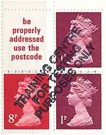 В 1930 году почтовое ведомство Великобритании создало школы для обучения почтовых служащих (Post Office Training Schools). Для этих учебных центров на марках, а также на других предметах, широко использовавшихся почтовым ведомством в то время, были сделаны различного рода надпечатки, превращающие их в так называемые псевдомарки[5] или учебные марки. Наиболее распространённой из них является надпечатка двух вертикальных чёрных полосок на имевших в тот момент хождение марках. Такие надпечатки были призваны предотвратить хищения, поскольку в таком виде марки нельзя было использовать, а также решить проблему необходимости отчитываться за них в обычном порядке.