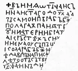 въ имѧ ѡтьца и съ//ина и с҃таго дѹха а//зъ самоип(л)ь рабъ б҃ж[и] // полагаѫ памѧть [ѡтьц]//ѹ и матєри и брат[ѹ н]//а кръстѣхъ сихъ · // имєна ѹсъпъш[ихъ ни]//кола рабъ б҃жи[и рипсими]//ѣ давдъ написа[…] // въ лѣто отъ сътво[рєниѧ мирѹ] // ѕ҃ ⁖ фа҃ · инъди[кта ѕ҃·]