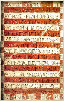 В соборе итальянского города Чивидале-дель-Фриули хранится алтарный образ архиепископа Аквилеи Пилгрима II (ок. 1200), латинская надпись которого выбивалась с помощью отдельных литер[8]. Наряду со штамповкой и чеканкой известна еще одна полиграфическая техника средневековья: в разрушенном в настоящее время Аббатстве Чертси в Англии обнаружились остатки надписи на мостовой XIII века, составленной из отдельных кирпичей с изображением букв, как в игре скрэббл[9]. Из сохранившихся документов известно, что подобные надписи были в монастыре Цинна (около Берлина)[9] и в монастыре Адюарв и монастыре Адюар (у Гронингена)[10].