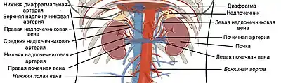 Надпочечник кровоснабжают три надпочечниковые артерии: верхняя надпочечниковая артерия (лат. arteria suprarenalis superior) — ветвь нижней диафрагмальной артерии (лат. arteria phrenica inferior), средняя надпочечниковая артерия (лат. arteria suprarenalis media) — ветвь брюшной аорты, и нижняя надпочечниковая артерия (лат. arteria suprarenalis inferior) — ветвь почечной артерии (лат. arteria renalis).[3]