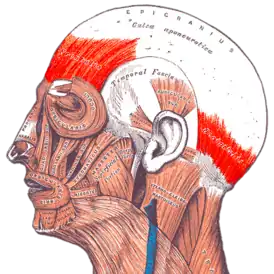 ![]() Изображение из учебника «Анатомия Грея»; надчерепная мышца выделена красным | |