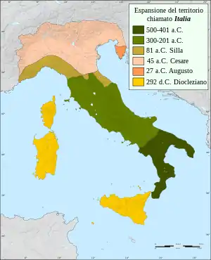 Греки, создавшие на юге Апеннинского полуострова Великую Грецию, способствовали распространению названия «Италия» применительно к более крупному региону. После того как Великая Греция к III–II векам до н. э. была поглощена Римской республикой, территориальная экспансия названия продолжилась[8] на центральную и северную части Апеннинского полуострова. В 49 году до н. э. Гай Юлий Цезарь дал римское гражданство населению провинции Цизальпийская Галлия[9], а между 43 и 42 годами до н. э. консулом Октавианом Августом эта провинция была объединена с Италией, тем самым границы Италии продвинулись на север до южного подножия Альп[10][11].