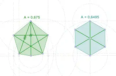 В случае n = 6 оптимальный многоугольник единственнен, однако он не является правильным. Решение для этого случая было опубликовано в 1975 Рональдом Грэмом в ответ на вопрос, поставленный в 1956 году Ханфридом Ленцом[3]. Решение представляет собой неправильный равнодиагональный пятиугольник с треугольником, прикреплённым к одной из его сторон, и расстояние от вершины этого треугольника до противолежащей вершины пятиугольника равно длине диагоналей пятиугольника[4]. Площадь этой фигуры равна 0.674981…[5], и это число удовлетворяет уравнению: