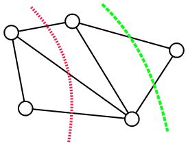 Граф и два его разреза. Красная пунктирная линия представляет разрез из трёх рёбер. Зелёная пунктирная линия представляет один из наименьших разрезов этого графа во втором смысле, состоящий только из двух рёбер. Оба разреза минимальны в первом смысле[1].