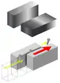 Накатные плашки представляют собой призматический брус, на рабочей поверхности которого нанесены канавки (нитки), соответствующие профилю резьбы. Плашки работают парой: одна подвижная, вторая неподвижная. Рабочие поверхности плашек параллельны и отстоят друг от друга с зазором, равным внутреннему диаметру резьбы.