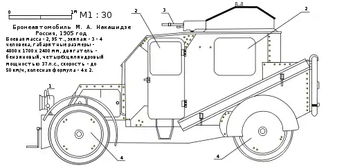 В 1904 году подъесаул Сибирского казачьего полка маньчжурской армии Михаил Накашидзе, сын генерала, князя Александра Накашидзе, в инициативном порядке разработал проект пулемётного бронеавтомобиля с учетом опыта войны в Маньчжурии. Незадолго до окончания русско-японской войны Накашидзе представил свой проект в Военное ведомство, где получил поддержку командующего маньчжурской армией генерала Николая Линевича. Инициатива энергичного офицера была одобрена. Постройка машины по российским чертежам была заказана французской фирме Charron, Girardot et Voigt, представившей в 1902 году один из первых в мире бронеавтомобилей — Charron 50CV. Однако монография М. Коломиеца "Русские броневики в бою" опровергает авторство Накашидзе в создании бронеавтомобиля. Кроме того указывается что князь являлся представителем компании «Шаррон, Жирардо э Вуа» и только лоббировал ее интересы в Генеральном штабе. В частности в переписке он представлялся как директор отдела бронированных автомобилей компании и фактически был ее совладельцем. Настоящий же автор проекта французский полковник-артиллерист Гюйе.