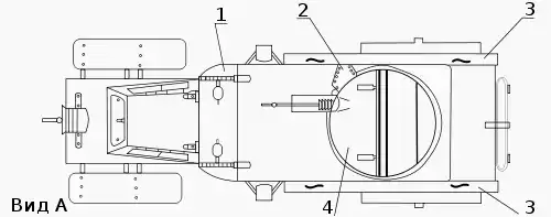 На крыше боевого отделения, находившегося позади отделения управления, располагалась средних размеров цилиндрическая башня со скошенными листами крыши. При этом передний скос являлся в то же время и люком, крышка которого могла подниматься в горизонтальное положение, так же, как и лобовой бронелист отделения управления. Весьма интересно был решён механизм поворота башни, не имевшей обычной впоследствии шариковой опоры. Башня опиралась на колонну, установленную на полу боевого отделения. Вручную, при помощи колеса, перемещавшегося по ходовому винту колонны, можно было приподнять башню над корпусом и повернуть её. Только в таком положении мог быть обеспечен круговой обстрел из пулемёта.[1][2]