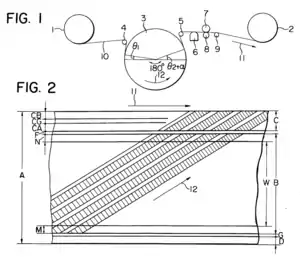 Широкополосный видеосигнал[* 1] записывается магнитными головками, установленными на специальном вращающемся барабане видеоголовок 3 (FIG. 1)[3]. Передача и приём сигнала с головок осуществляется с помощью встроенного вращающегося трансформатора[4]. Магнитная лента 10 охватывает цилиндрический барабан с видеоголовками[* 2] по спирали, благодаря чему головки при вращении барабана записывают на ленте наклонные строки видеосигнала[5][6]. Наклонно-строчная видеозапись пришла на смену поперечно-строчной, не позволявшей изменять скорость воспроизведения и осуществлять электронный видеомонтаж. Первые видеомагнитофоны, работающие по такому принципу, были разработаны фирмой «Бош» и использовали магнитную ленту шириной в 1 дюйм (25,4 мм)[7]. Такой способ позволяет записать высокочастотный сигнал благодаря высокой скорости движения видеоголовок относительно магнитной ленты и применяется в большинстве форматов видеозаписи, в том числе VHS, Betamax, U-matic, Betacam, Hi8, DV, дюймовом формате «С» и т. д. Кроме того, наклонно-строчная запись применяется при цифровой регистрации других типов информации[* 3].