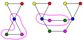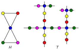 Например, пусть v будет одной из пурпурных вершин из C. Она имеет два соседа в C, зелёную вершину u и голубую вершину t. Аналогично, пусть v′ будет пурпурной вершиной из H. Она имеет два соседа в H, зелёную вершину u′ и синюю вершину t′. Отображение f, суженное на {t, u, v}, является биекцией в {t′, u′, v′}. Это иллюстрирует следующий рисунок: