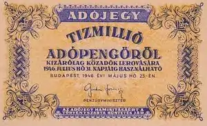 После окончания Второй мировой войны национальная валюта Венгрии (пенгё) в результате гиперинфляции быстро обесценилась. 1 августа 1945 года доллар США стоил 1 320 пенгё, 1 октября того же года — 8 200 пенгё, 1 декабря — 128 000 пенгё.