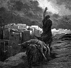 Внезапно местные жители окружают дом, и требуют у пожилого хозяина «выведи того человека, который вошел в дом твой, и мы познаем его» (познать в этом контексте эвфемизм полового акта)[3].