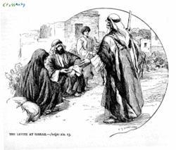 Наложница некоего левита из гор Эфраима оставила его и вернулась в родительский дом в Вифлееме. Левит со слугой и парой ослов отправился за ней. На протяжении пяти дней её отцу удавалось задержать его возвращение. На пятый день к вечеру левит покинул его дом.